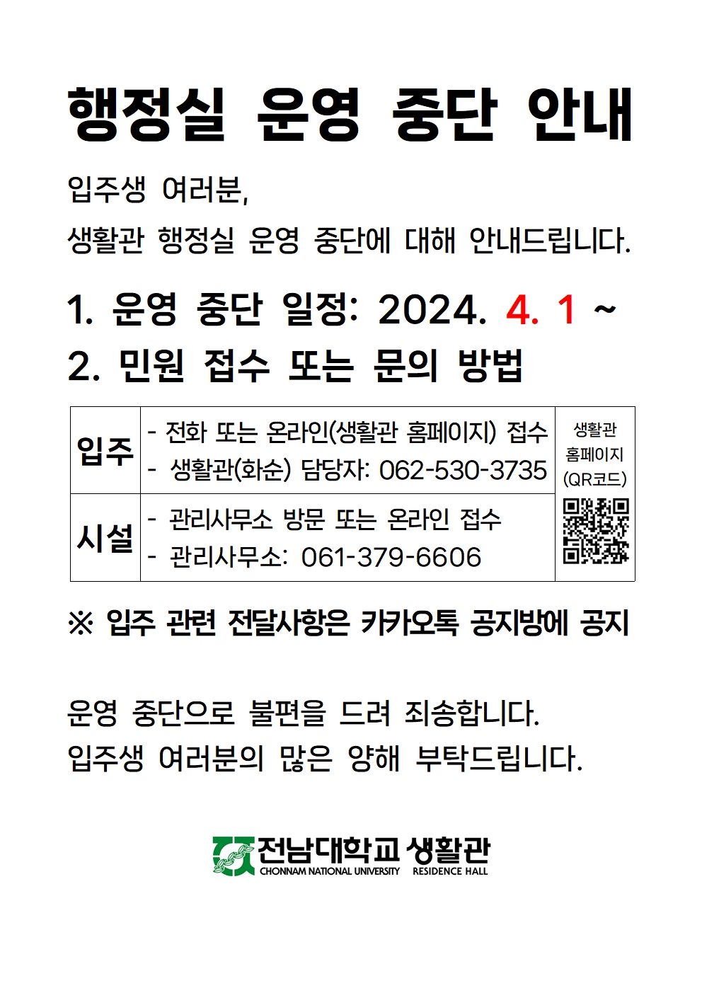 행정실 운영 중단 안내 및 공지방 QR
