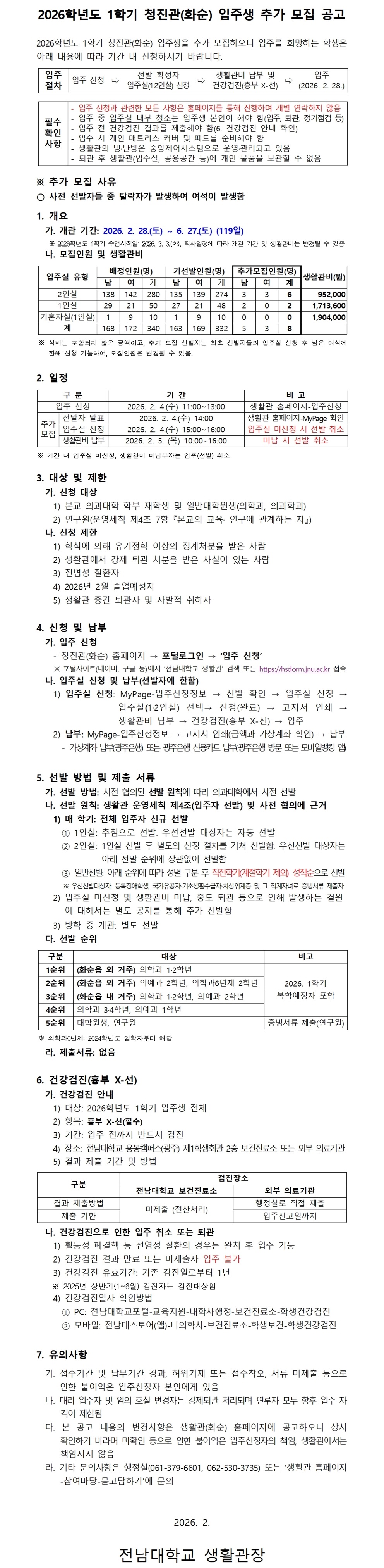 2026학년도 1학기 생활관(화순) 입주생 추가 모집 공고